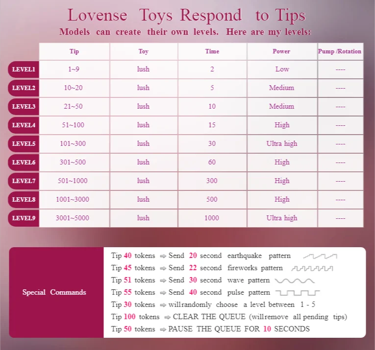 Nhảy Khiêu Dâm, Múa Thoát Y, Ở trần, Ahegao, Mê bàn chân, Hóa trang, Twerk, Móc cua, Thổi kèn, Sóc lọ, Đánh đòn, Lộ hàng, Cực mạnh, Cực khoái, Củ dildo hay Máy rung, Thủ dâm, Đồ chơi Tình dục, Quan hệ kiểu Doggy, Hút thuốc, Dây strapon