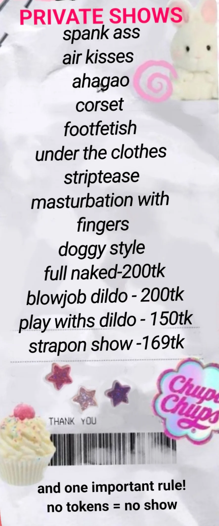 Đánh đòn, Ahegao, Hóa trang, Áo coóc-xê, Mê bàn chân, Vén váy, Quan hệ kiểu Doggy, Ngón chân lạc đà, Đánh giá Dương vật, blowjob200tk, full naked200tk, handjob hand, rideDildo 150tk, show pussy, Kiểu Cưỡi Ngựa, Nylon, Nhảy Khiêu Dâm, Cách nói Gợi Dục, Lộ hàng, Thủ dâm, Đẩy ngực, Thổi kèn, Múa Thoát Y, Bịt miệng, Sex toy dildo 150tk, handjob, strapon show 169tk, show holes, blowjob dildo 200tk, show tits 200tk, anal plug 400tk, Đồ chơi Tình dục, Bú tràn họng, Củ dildo hay Máy rung, SPH (Sự hạ nhục dương vật nhỏ), Móc cua, Cực khoái, Nữ đóng cọc